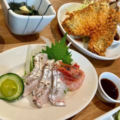 本日の週替わり定食は炙り太刀魚、甘エビのお刺身とアジフライ